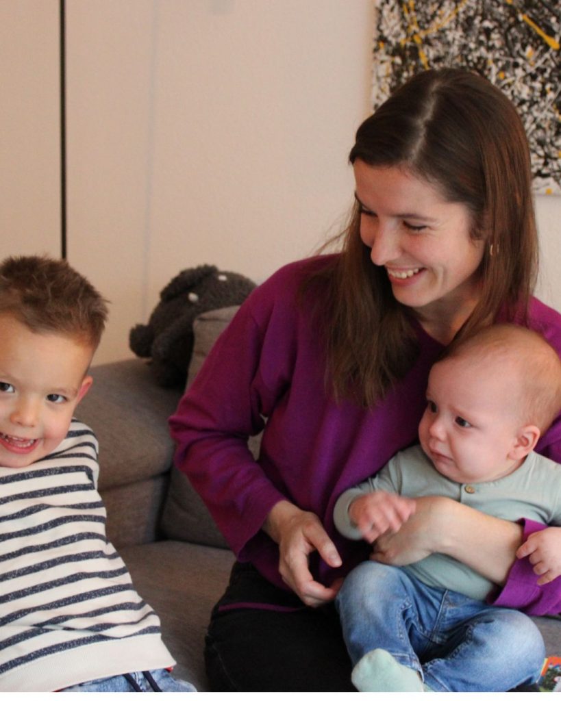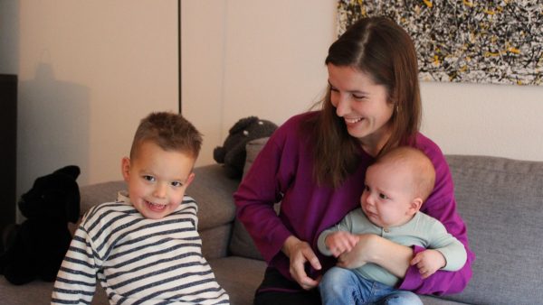Andrea geeft Ezra de fles terwijl ze vertelt over hun dagelijkse routine. “In de ochtend is Joah altijd als eerste wakker. Hij gaat dan alvast spelen. Daarna ontbijten we samen. Wat ontbijten we Joah?”, vraagt ze. “Yoghurt met granola,” zegt hij. “Ja, en in het weekend maakt papa bananenpannenkoekjes.” Joah bladert ondertussen door een tijdschrift over brandweerman Sam, zijn grote held.