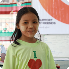 Phoo Thet, een leerling uit klas 3, zegt: “Toen de aardbeving kwam, was ik thuis met mijn oudere zus. Ik moest huilen omdat ik zo bang was. Ik ben blij dat ik mee mag doen aan het ‘I Support My Friends’-programma, want ik kan spelen met mijn vrienden. We krijgen snacks en maaltijden, en we leren hoe we elkaar kunnen steunen.”